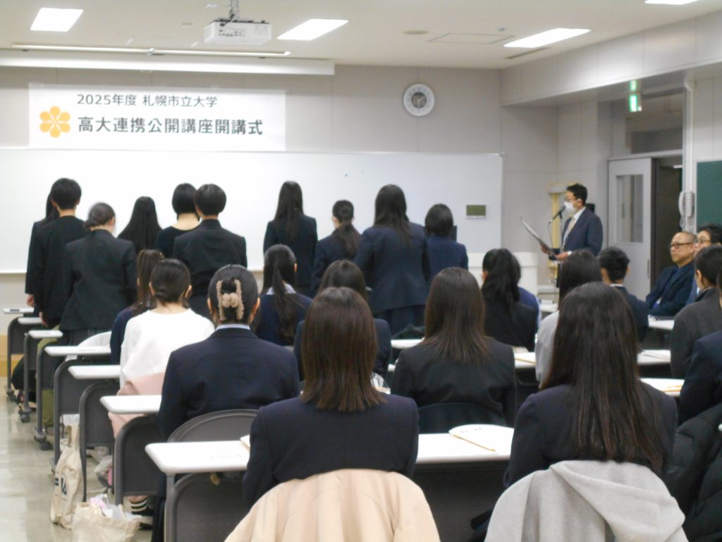 開講式では、各市立高校の校長先生等のご臨席のもと、受講生のお名前がひとり一人読み上げられた後、樋之津学部長から励ましの言葉が贈られ、札幌市立高等学校・特別支援学校 校長会の尾崎会長(札幌旭丘高等学校長)からご挨拶をいただきました。