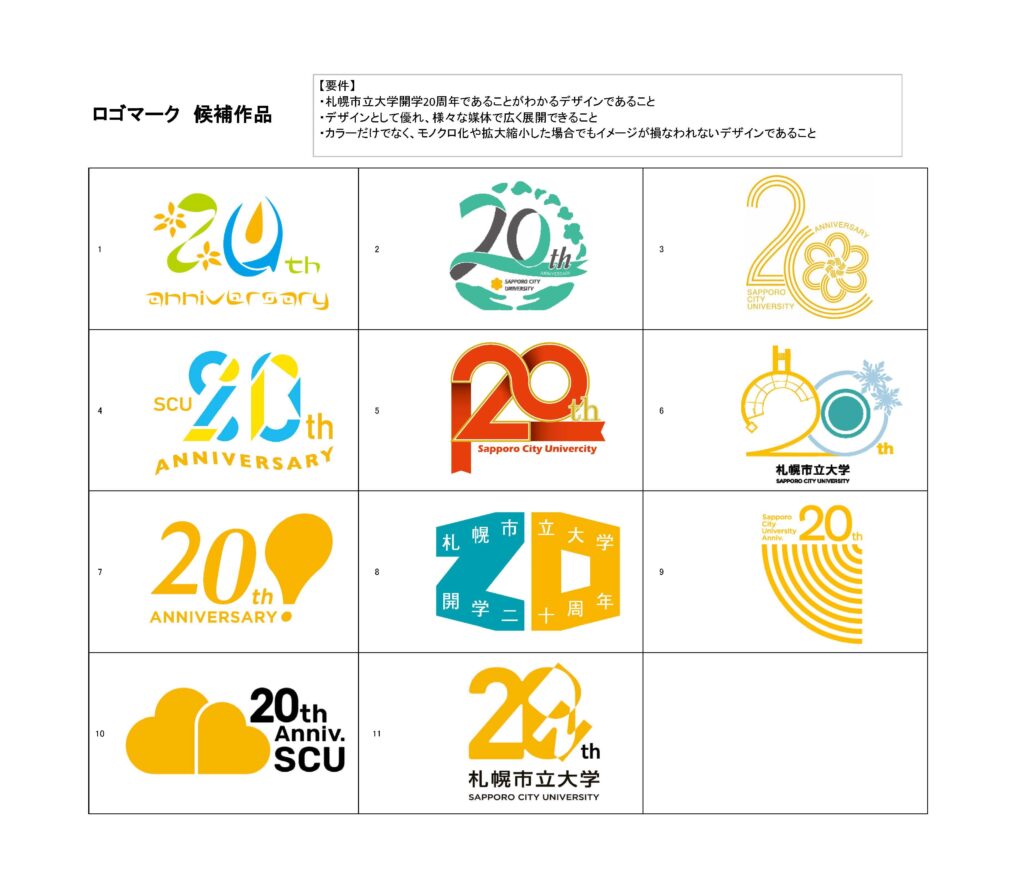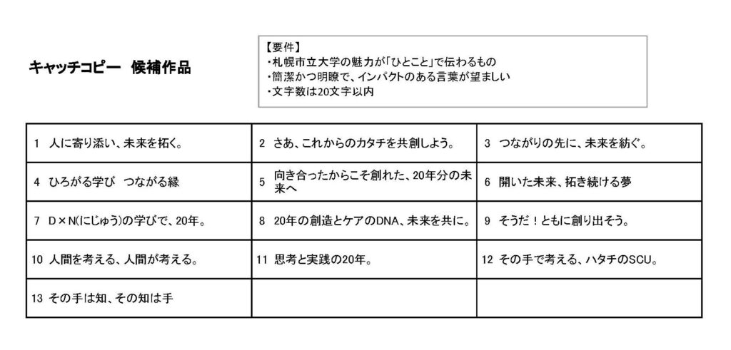 札幌市立大学開学 20周年を記念した「キャッチコピー」及び「ロゴマーク」を本学学生・卒業生・修了生、教職員より募集し、キャッチコピー56作品、ロゴマーク22作品のご応募がありました。たくさんのご応募をありがとうございました。