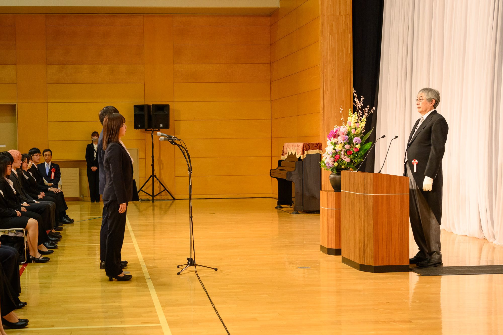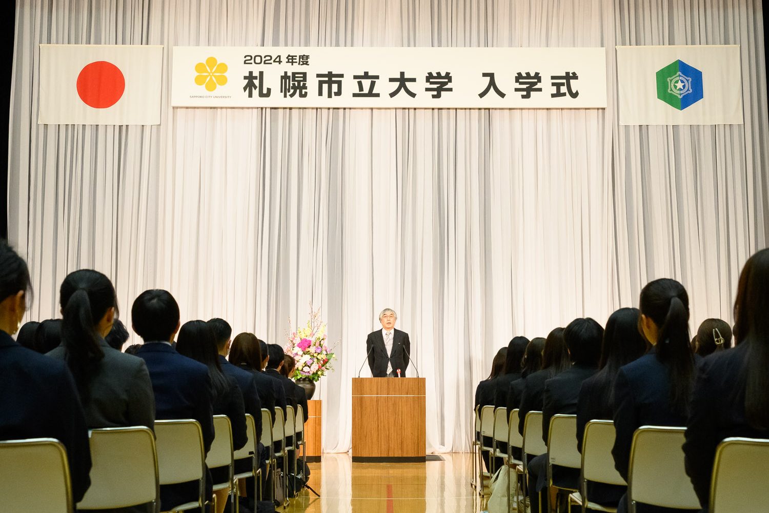 4月3日(水)午前10時より、芸術の森キャンパスアリーナにて、2024年度札幌市立大学入学式を執り行いました。式では、デザイン学部、看護学部、助産学専攻科、デザイン研究科、看護学研究科の新入生計222名一人ひとりの氏名が読みあげられ、全員の入学が認められました。その後、中島学長による式辞、秋元札幌市長による来賓祝辞、新入生代表による宣誓が述べられ、最後に大学歌を合唱して式が終了しました。