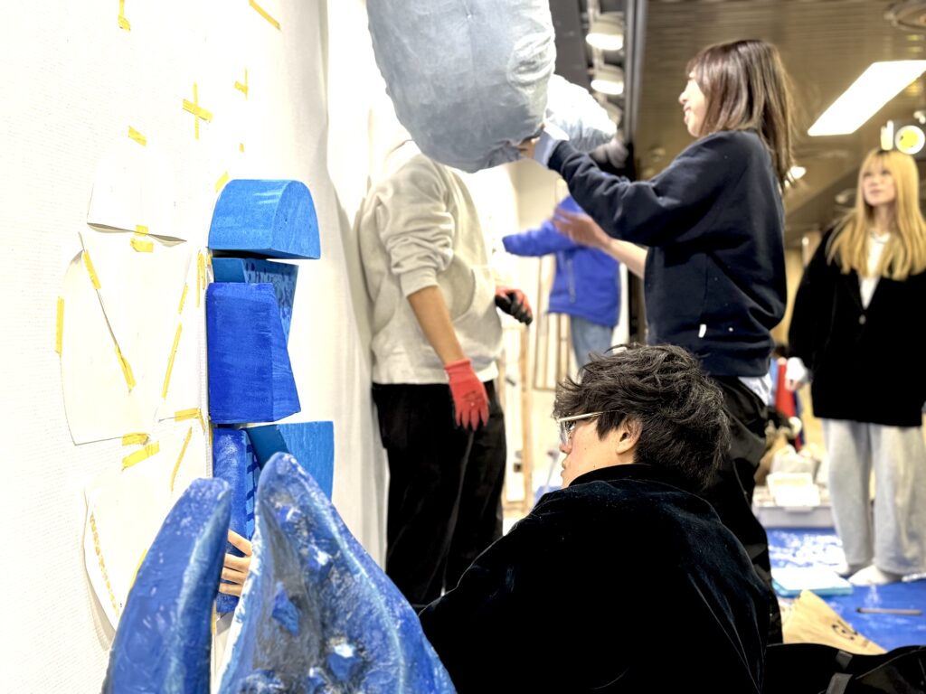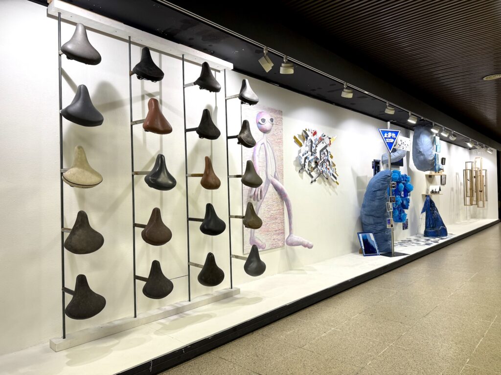 500m美術館の幅12mのガラスケース8基のうち、1校につき1ケースを使用して、計8校がグループ展形式で作品を展示し、約60名の学生が参加して、個性を発揮しています。