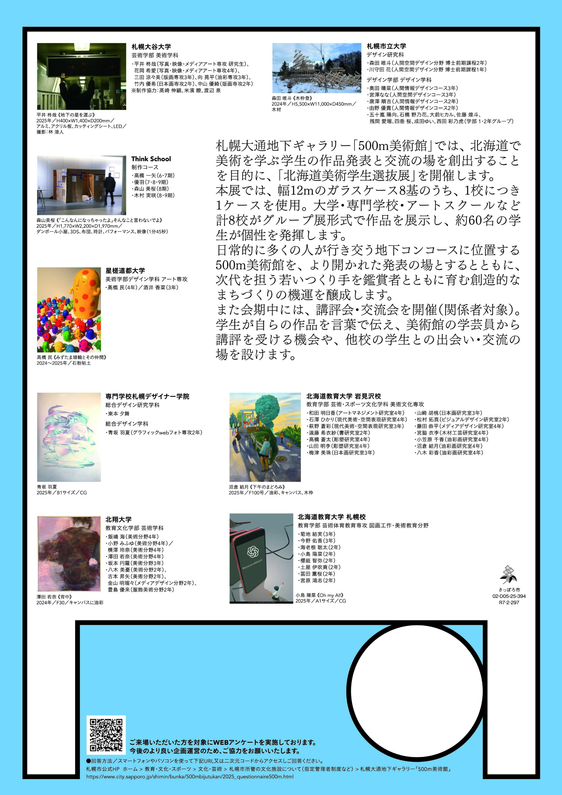 札幌大通地下ギャラリー500m美術館において、北海道で美術を学ぶ学生の作品発表と交流の場を創出することを目的に「北海道美術学生選抜展」が開催され、デザイン研究科及びデザイン学部の学生が作品を出展します。