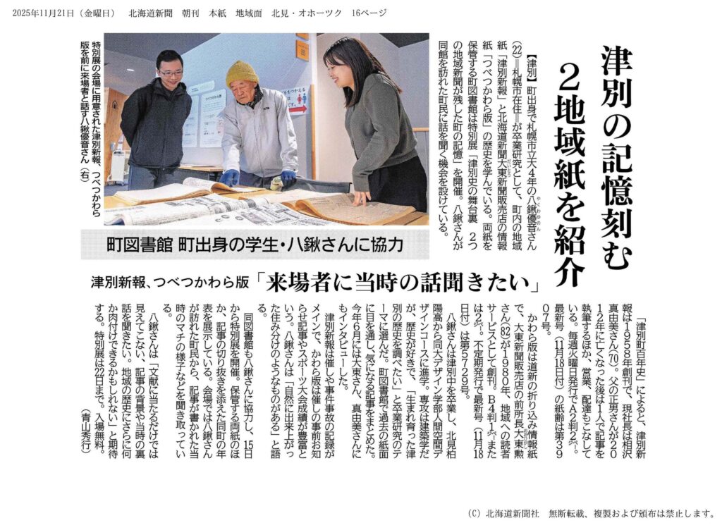 デザイン学部4年・八鍬優音さん(小林研究室)は、卒業研究として、津別町図書館との共催により、町の出来事を伝えてきた二つの地域新聞「津別新報」と「つべつかわら版」をテーマとした企画展「津別史の舞台裏 ― 2つの地域新聞が残した町の記憶 ―」を開催しました。